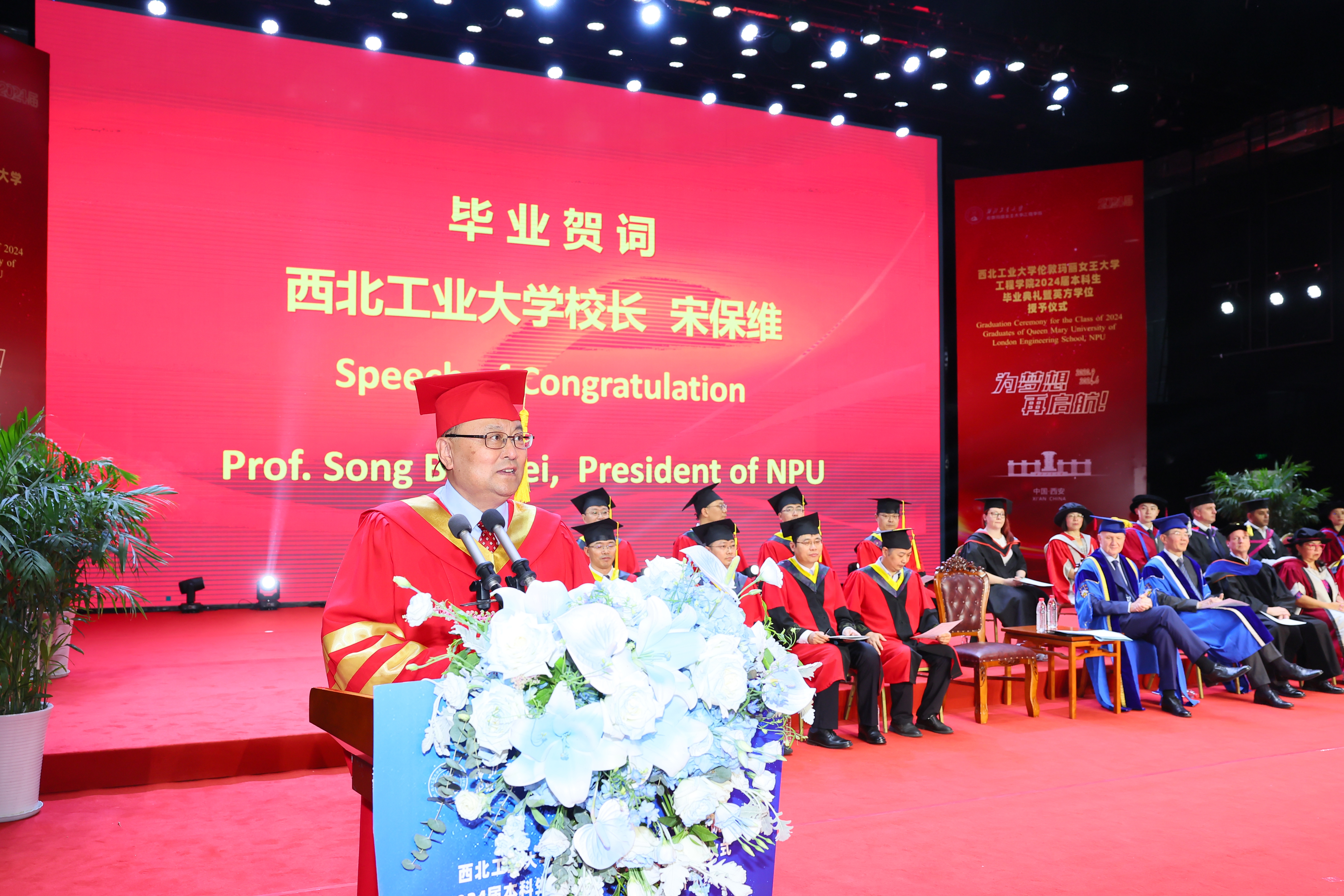宋保维代表李言荣书记和全体师生向同学们圆满完成本科阶段学业表示诚挚祝贺和美好祝愿,向长期以来关心支持学校发展、培养学生成长成才的中英双方教师及家长朋友们表示感谢。他表示,同学们在过去四年见证了两校之间的合作共进,同时不断突破自我、追求卓越,在各类活动中取得了优异成绩。临别之际,他向同学们提出了三点期望:一是希望同学们志存高远、胸怀天下,在时代浪潮中奋楫笃行。二是希望同学们勤学深耕、惟实励新,在脚踏实地中奋勇争先。三是希望同学们放眼世界,拓宽视野,在拥抱未来中胜任全球。宋保维深情地说:“无论大家身在何方,母校永远是你们最坚实的依靠和最温暖的港湾,也希望同学们一如既往地关心支持母校的发展,欢迎你们有机会常回来看看! ”