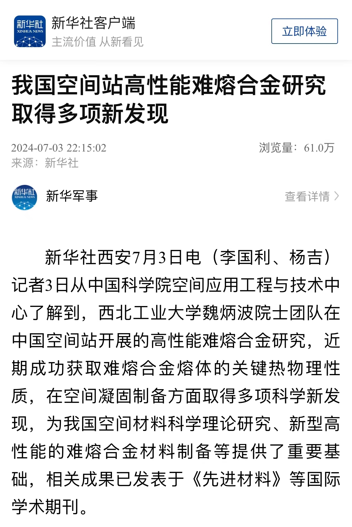 中国空间站天和核心舱已在轨稳定运行3年,期间,taptap点点物理科学与技术学院魏炳波院士团队制备的10余种数百个高性能难熔合金样品先后在空间站无容器材料试验柜中进行了6批次在轨实验,获得了大量关键科学数据,有望为探索新材料提供指导,相关空间材料科学领域成果获得央视新闻、新华社、《瞭望》新闻周刊等媒体密切关注。