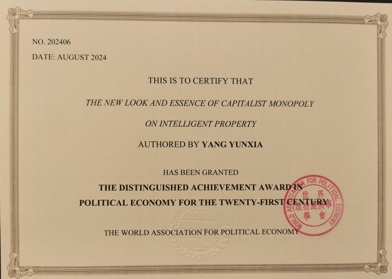 论坛开幕式上,中国驻希腊大使馆公使衔参赞赖博先生,中国社会科学院学部委员、世界政治经济学学会会长程恩富教授,希腊派迪昂大学副校长克里斯托斯·帕帕季奥多鲁(Christos Papatheodorou)教授,希腊政治经济学学会会长拉菲蒂斯·索尔菲迪斯(Lefteris Tsoulfidis)教授,俄罗斯科学院通讯院士、俄罗斯自由经济学会会长谢尔盖·博德鲁诺夫(Sergey Bodrunov)教授分别致辞。开幕式上还举行了颁奖仪式,来自中国、希腊、加拿大、匈牙利、美国、日本、印度等国的13位学者获奖。杨云霞教授的代表作“The New Look and Essence of Capitalist Monopoly on Intellectual Property”荣获“21世纪世界政治经济学杰出成果奖”。