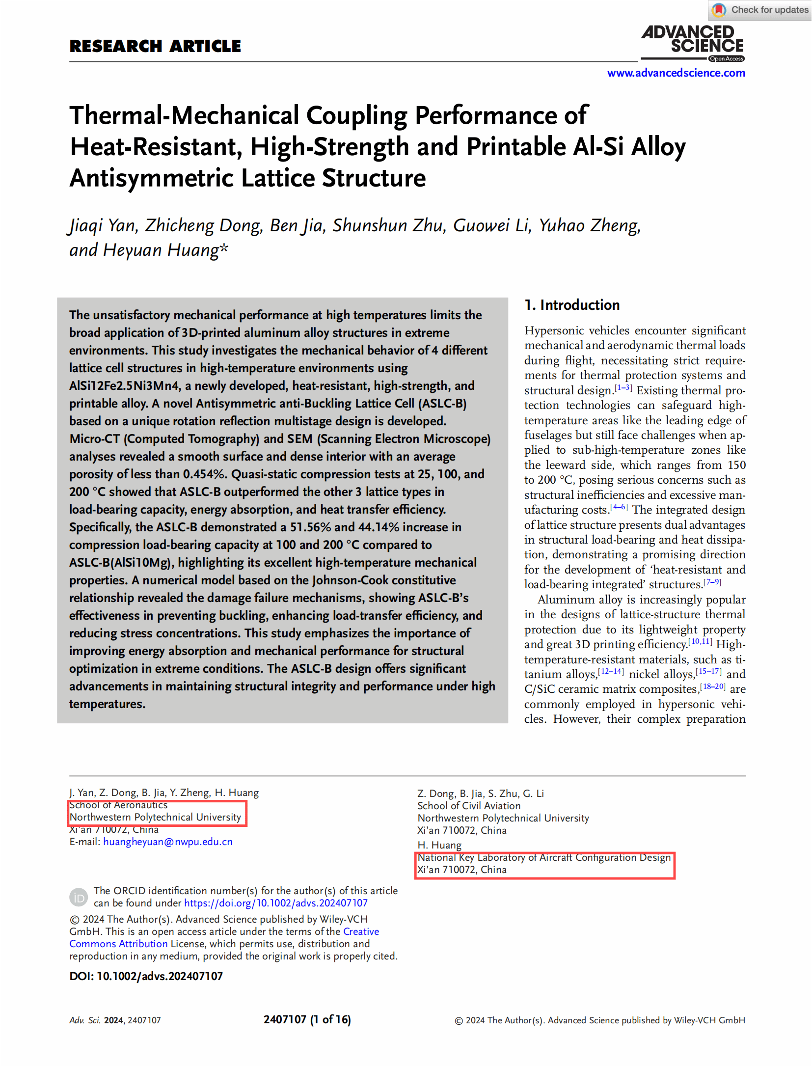 近日,航空学院黄河源副研究员团队在防热-承载一体化轻质点阵超材料方向取得重要进展,相关研究成果以“Thermal-Mechanical Coupling Performance of Heat-Resistant, High-Strength and Printable Al-Si Alloy Antisymmetric Lattice Structure”(耐温高强可打印的Al-Si反对称点阵结构热力耦合研究)(DOI:10.1002/advs.202407107)为题发表在国际顶级学术期刊《Advanced Science》(综合类一区TOP期刊,影响因子14.3)。航空学院严家琪硕士研究生为论文第一作者,黄河源副研究员为通讯作者,董志城博士研究生和贾犇博士研究生为本文共同一作,taptap点点体育及飞行器基础布局全国重点实验室为该论文唯一署名单位。该研究得到了国家自然科学基金重点项目、陕西省科技创新团队项目、中央高校专项资金项目、taptap点点体育博创基金和taptap点点体育研究生实践与创新基金等项目的资助。