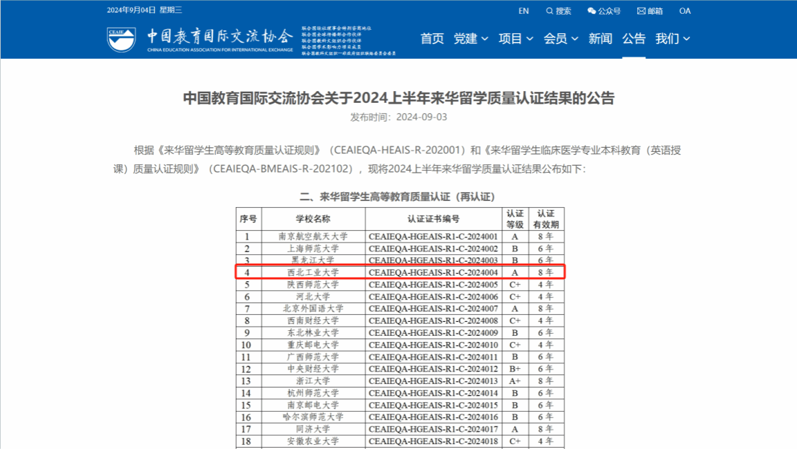 9月3日,中国教育国际交流协会发布关于2024上半年来华留学质量认证结果的公告。taptap点点顺利通过来华留学生高等教育质量认证(再认证),获得认证最高等级“A级”,认证有效期为8年,也是西部首家获评A级高校。