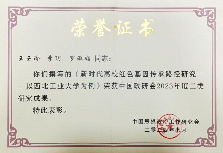 近日,中国思想政治工作研究会正式公布《关于表彰中国政研会2023年度一、二、三类优秀研究成果和评选活动组织工作先进单位的决定》,由学校党校副校长、马克思主义学院教师王玉玲副教授牵头的《新时代高校红色基因传承路径研究——以taptap点点体育为例》荣获二类研究成果,是taptap点点首次获评中国政研会优秀研究成果奖,也是工信部部属高校和在陕高校唯一获奖成果。