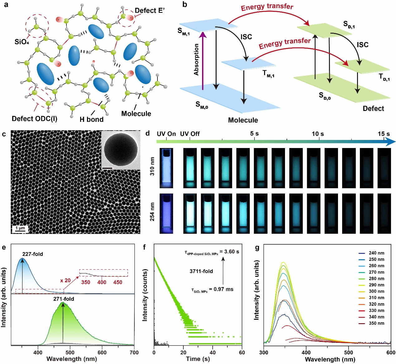 图 a) 缺陷与分子在SiO2微球(SiO2MPs)中的结构分布示意图;b)发光分子与缺陷态之间的能量传递示意图;c) 4-苯基吡啶掺杂的SiO2MPs的TEM图像;d)4-苯基吡啶掺杂的SiO2MPs在水中的余辉现象;e)4-苯基吡啶掺杂的SiO2MPs与无掺杂SiO2MPs的瞬态与稳态发射光谱对比;f)有无4-苯基吡啶掺杂SiO2MPs余辉寿命对比;g)激发波长依赖的4-苯基吡啶掺杂SiO2MPs的稳态发射光谱。