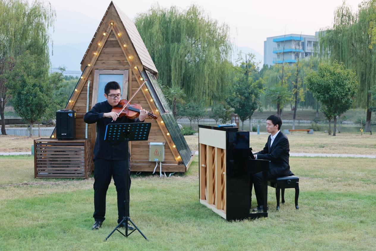 这6座钢琴木屋分别以“风吟”“雅律”“时夕”“云弦”“怀音”“阅音”命名。钢琴空间与自然相融,青山、绿水、漂亮的ARJ21、鸟语、花香、悠扬的琴声环绕,共同谱写了一幅大美工大、和谐工大的绚烂画卷。