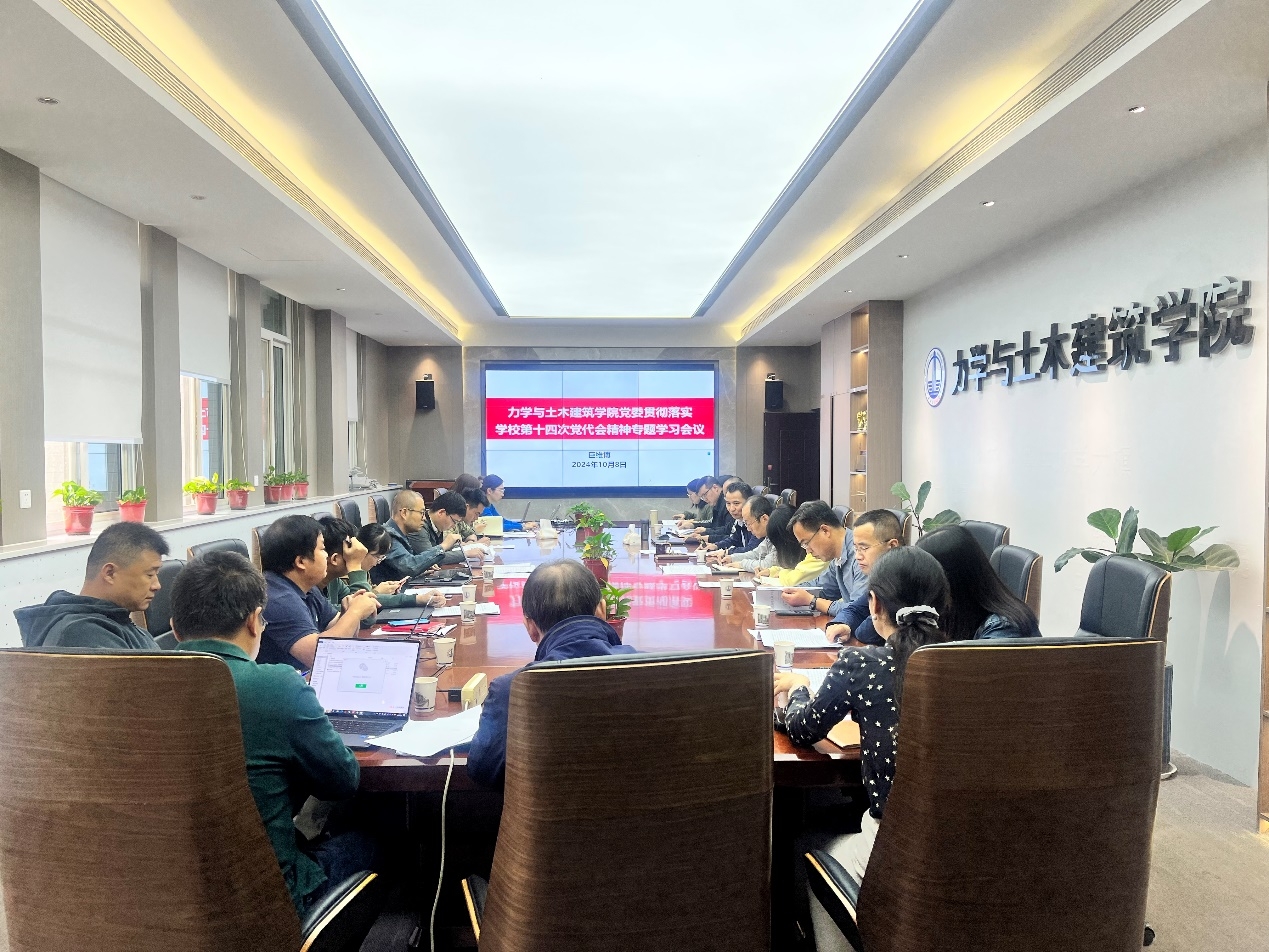 10月8日上午,力学与土木建筑学院在206会议室组织召开专题会议集中学习学校第十四次党代会报告,研究部署贯彻落实举措。学院班子成员、院长助理、系(副)主任、教工党支部书记、院办秘书等参加会议,会议由学院党委书记巨维博主持。8日下午,学院召开党委会和党政联席会,围绕学院落实党代会报告要求进行深入研讨。