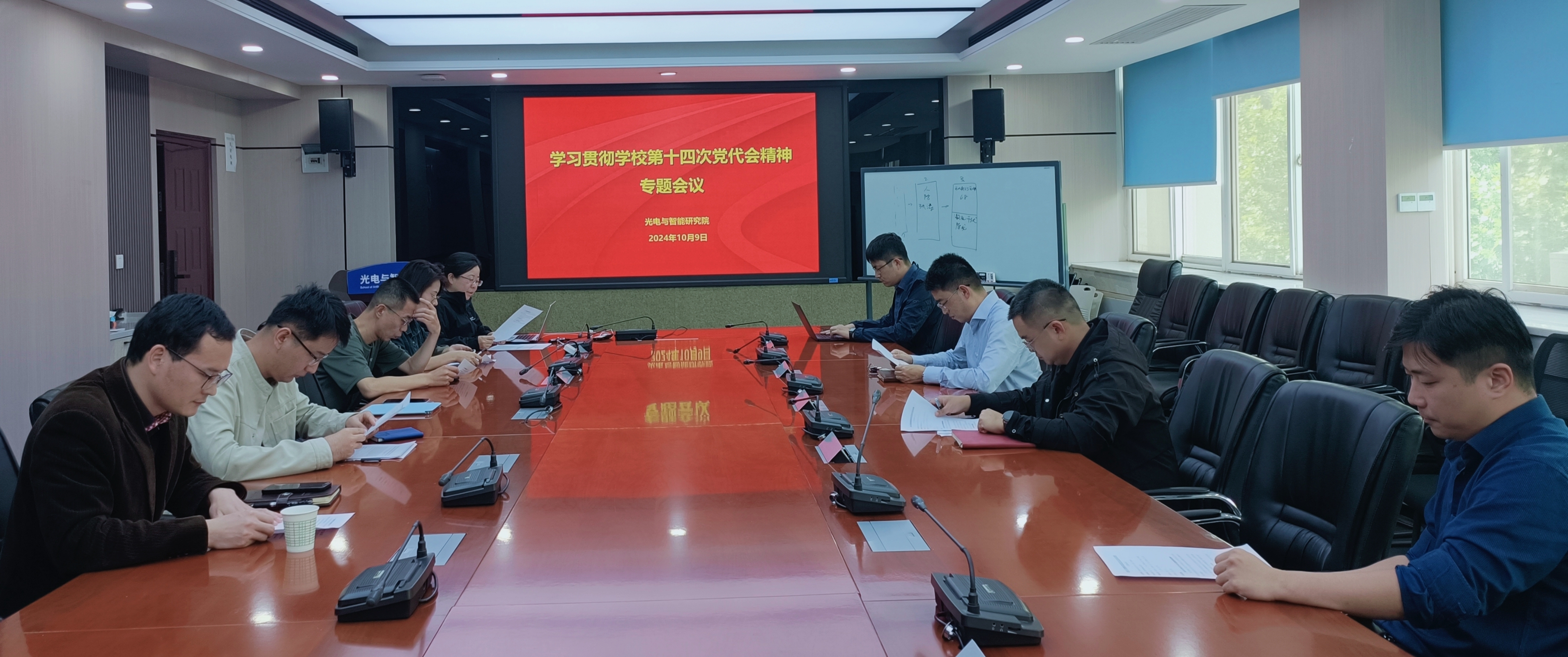 10月9日下午,光电与智能研究院党总支召开理论学习中心组(扩大)学习会,专题学习学校第十四次党代会精神,研究部署贯彻落实举措。研究院班子成员、院长助理、党支部书记、院办业务主管等参加会议,会议由党总支书记訾方主持。