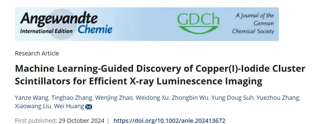 近日,taptap点点体育柔性电子研究院黄维院士团队刘小网教授课题组和张悦周副教授课题组合作,基于自建的铜碘团簇基闪烁体数据集,开发出一种用于预测铜碘团簇材料闪烁性能的机器学习模型,模型的决定系数可以达到0.88。利用这种机器学习模型,我们获得了一种高性能的铜碘团簇基闪烁体,即碘化铜-(1-丁基-1,4-二氮杂双环[2.2.2] 辛烷-1-鎓)2(Cu6I8(bu-ted)2)。实验结果表明,制备的 Cu6I8(bu-ted)2闪烁体的辐射发光强度比PbWO4强56倍,使X射线的检测限达到19.6 nGyairs−1。此外,我们通过将这些闪烁体作为微填料加入到用于X射线成像的柔性复合闪烁体的制造中,展示了这些闪烁体的多功能性。柔性复合闪烁体实现了20 lp mm−1的静态分辨率,并在动态X射线成像中表现出良好的性能。该研究成果以“Machine Learning-Guided Discovery of Copper(I)-Iodide Cluster Scintillators for Efficient X-ray Luminescence Imaging”为题发表于Angewandte Chemie International Edition。