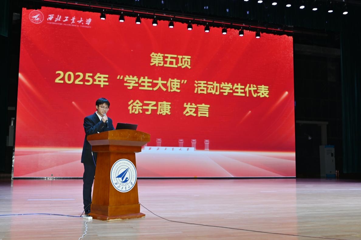 航海学院2024级本科生徐子康作为新一届“学生大使”代表发言,他讲述着在高中时期就聆听过西工大“学生大使”的宣讲,对西工大“总师摇篮、为国铸剑”的形象记忆犹新,一颗西工大梦种子在心中逐步扎根、发芽的故事。如今,作为新一期“学生大使”即将启航的他,将会在更多高中学子心中播下这颗“为国铸剑”的种子,吸引更多有志青年投身到国防科技事业的建设中。