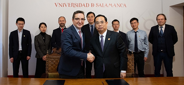12月3日,代表团一行访问了西班牙萨拉曼卡大学,程基伟与萨拉曼卡大学校长胡安·曼努尔进行了会谈。胡安·曼努尔介绍了萨拉曼卡大学悠久的办学历史以及在学术研究和科研成果转化方面的优势,并着重分享了学校近年在国际化人才培养方面的最新成果。程基伟基于双方优势,提出了在国际化人才培养、联合实验室建设、文化交流等三方面的合作提议,并得到萨拉曼卡大学的积极回应。双方就开展学生交流及科研合作项目等相关事宜,续签了两校框架合作协议。