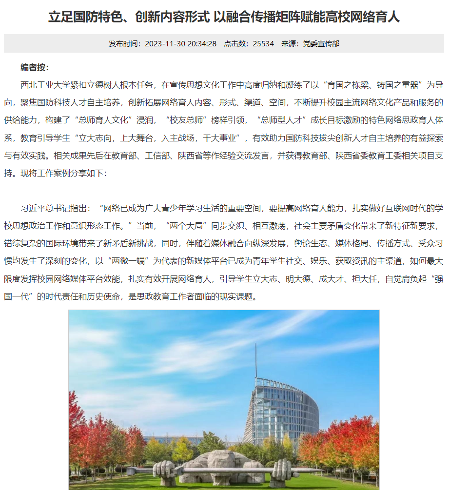 近年来,学校深入学习贯彻习近平文化思想,充分发挥网络文化育人功能,不断健全完善培育优质网络文化作品的工作机制,注重培育师生网络素养和创新能力,以美育人、以文化人,用优质的网络作品和丰富的网络文化活动不断发挥网络滋养人心、凝聚力量的积极作用,为学校“127”近期目标和“天下工大、世界三航”远景目标的实现持续贡献力量。