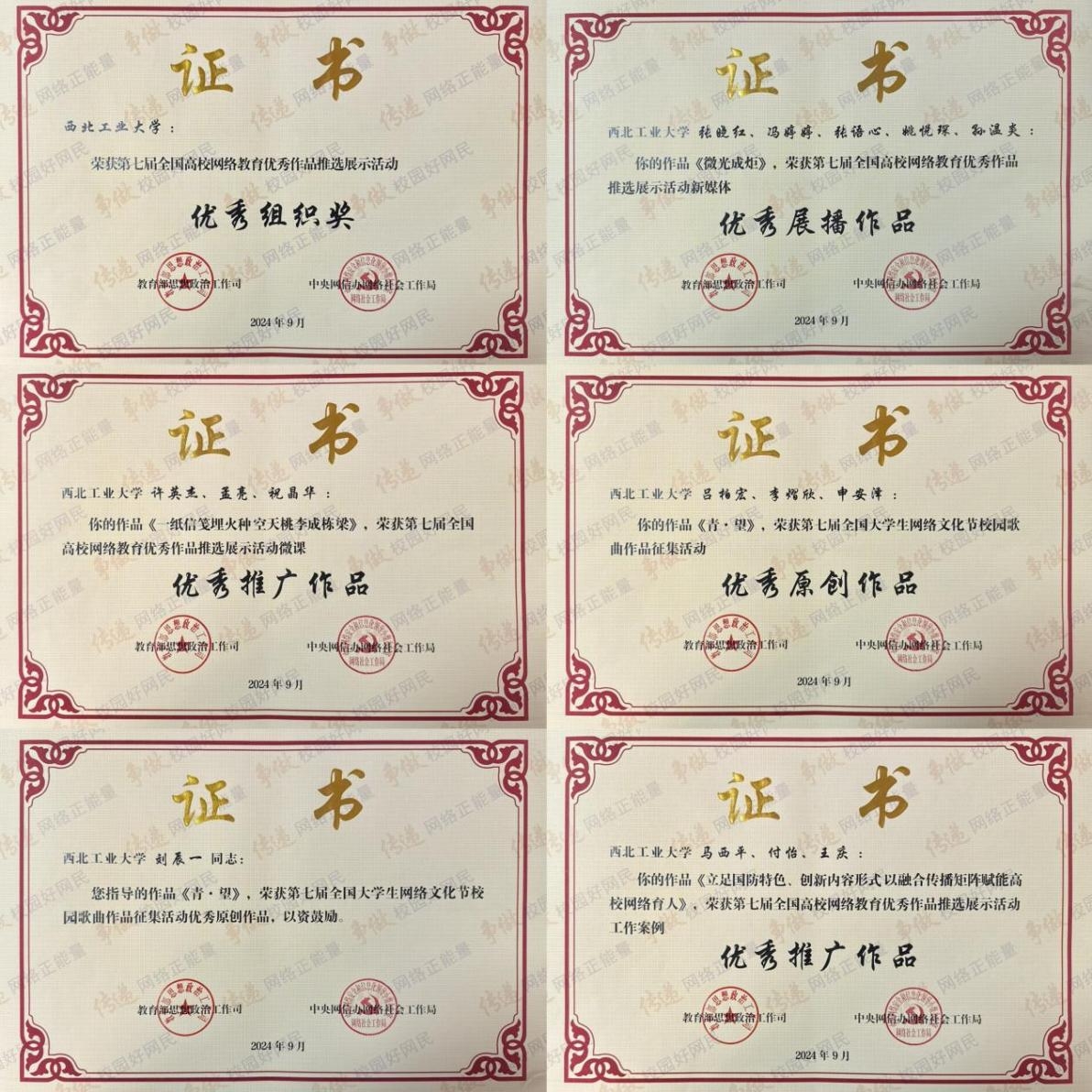 自2023年9月第七届“全国大学生网络文化节”和“全国高校网络教育优秀作品推选展示活动”启动以来,党委宣传部会同党委组织部、党委学生工作部、离退休工作处、工会、团委、艺术教育中心等各相关单位协调推进,在全校开展网络文化作品孵化培育工作。校内各部门和广大师生积极响应,经过层层筛选,共报送55件作品参加省评,获陕西省推荐38件作品参加国评,最终4件作品获奖,其中优秀推广作品2项、优秀展播作品1项、优秀原创作品1项。