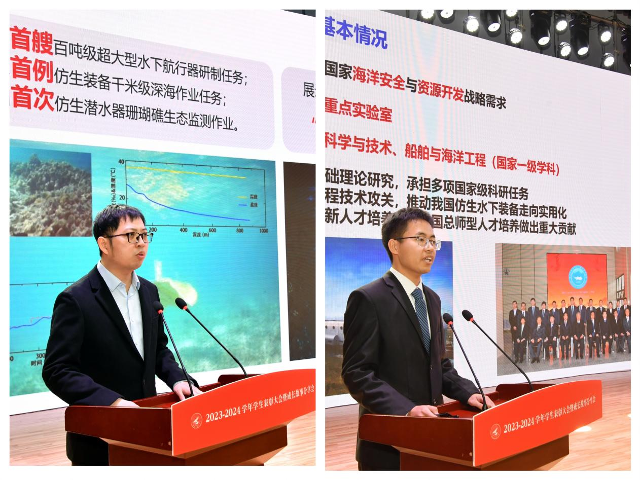 模范班级代表、物理科学与技术学院2021级强基班班主任宋坤、班长范振坤携手上台,从“坚定理想信念,厚植报国情怀”“筑牢数理基础”“提升科学素养,锻炼科研能力”“践行五育并举,立志全面发展”四个方面分享了大家互信互助,走进大团队、走上大舞台,“如同物理学中的合力与分力,相互依存、不可分割”的成长故事。模范研究生导学团队代表、航海学院“智能仿生潜水器”科技创新团队指导老师叶鹏程与硕士研究生李鑫,共同讲述了团队秉持“向海图强,向海而兴”理念,面向国家海洋安全和资源开发战略需求,依托自主水下航行器团队将立德树人与科研实践相结合的青春宣言。