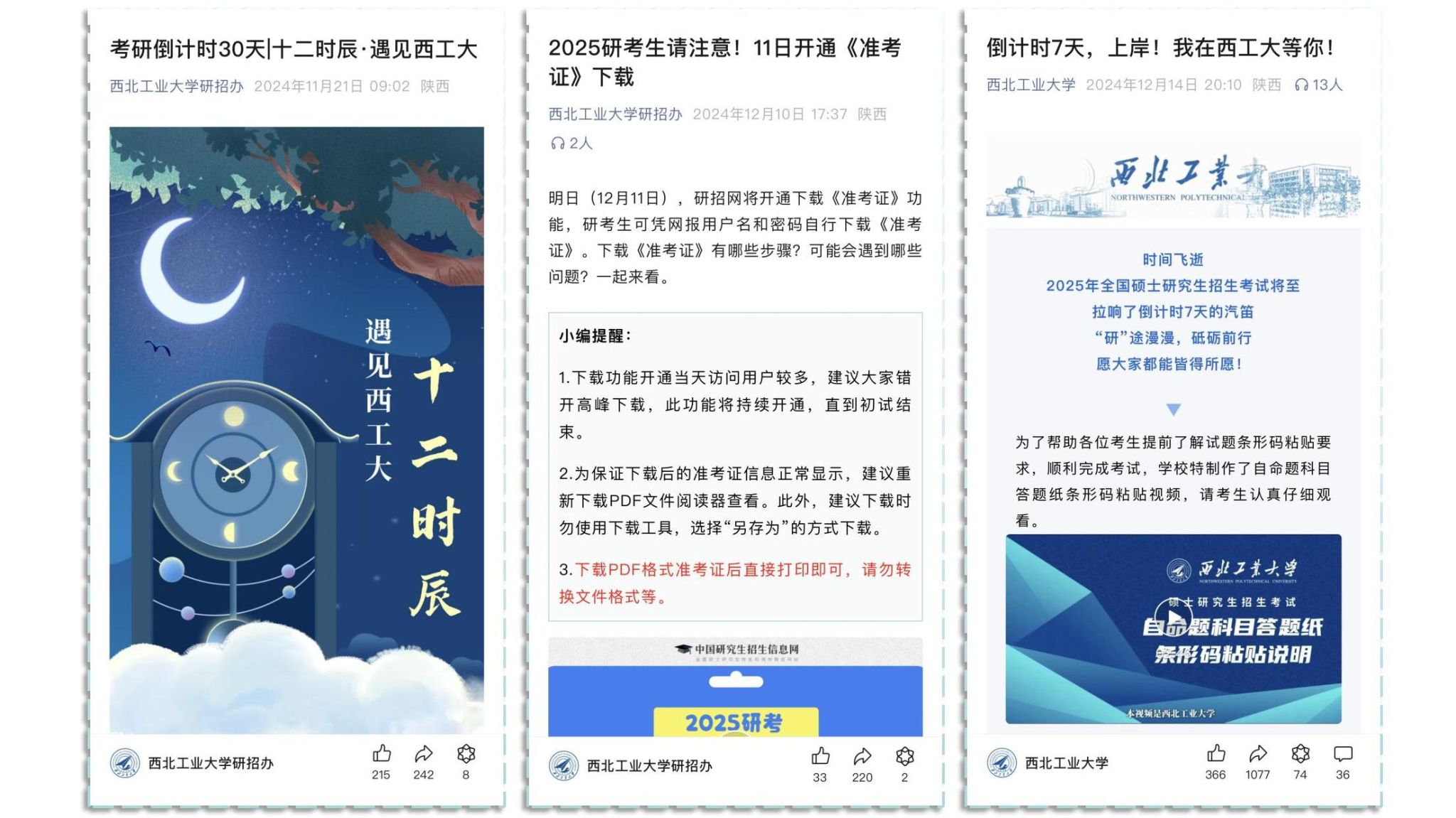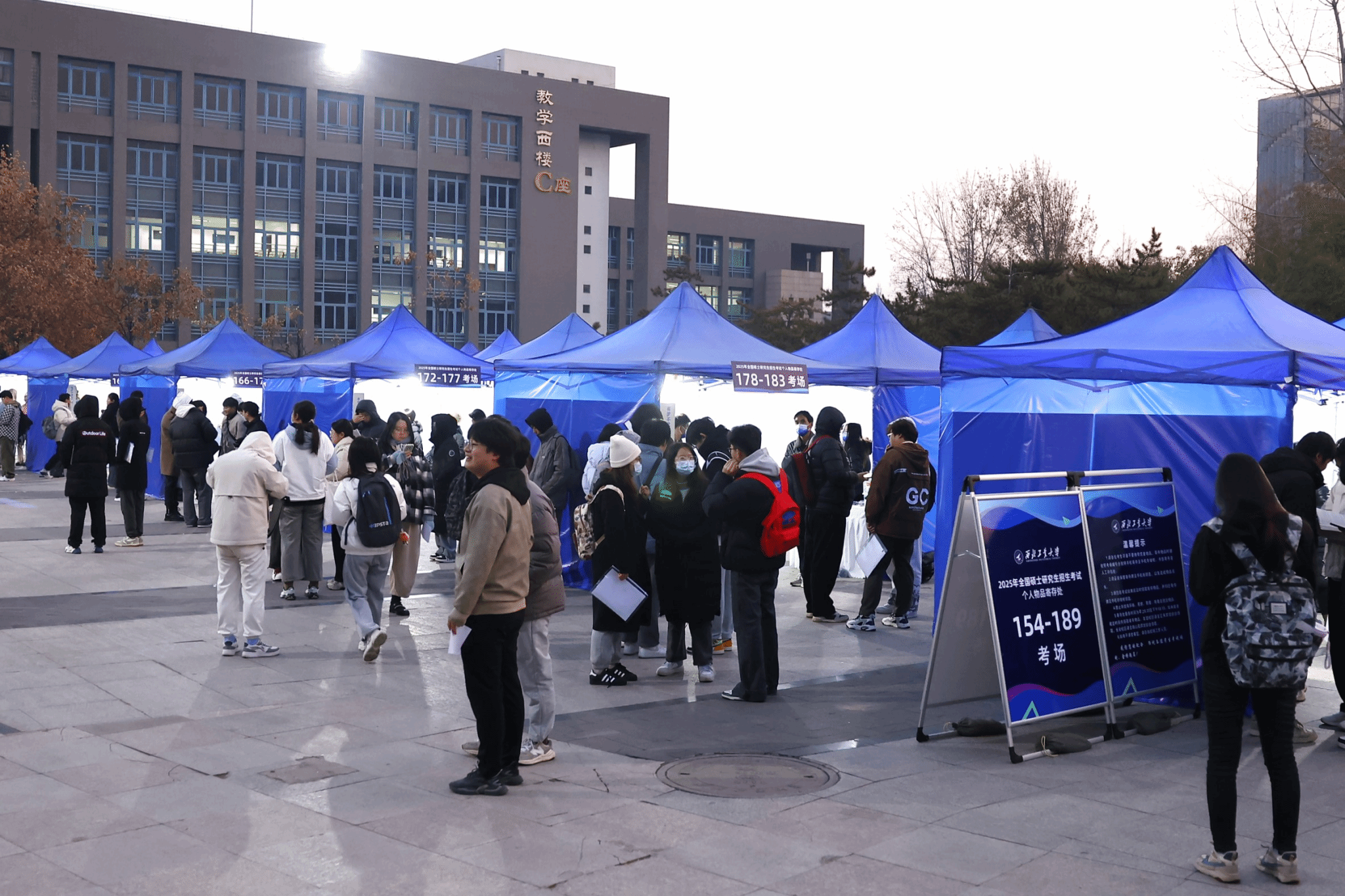 学校坚持以考生为本的服务理念,不断提升服务考生质量。在学校主页、研招网和官微等平台发布考点公告、考场规则、交通餐饮等考试服务信息,尽可能为考生提供合理便利。及时发布“自命题科目答题纸条形码粘贴说明”“考场路线指引”“安检须知”等视频,更为直观地为考生展示应考要求。在校园各个入口设置到达考场的路牌、指示牌,提前一天安排考生熟悉考点环境等,共同营造良好考试氛围。