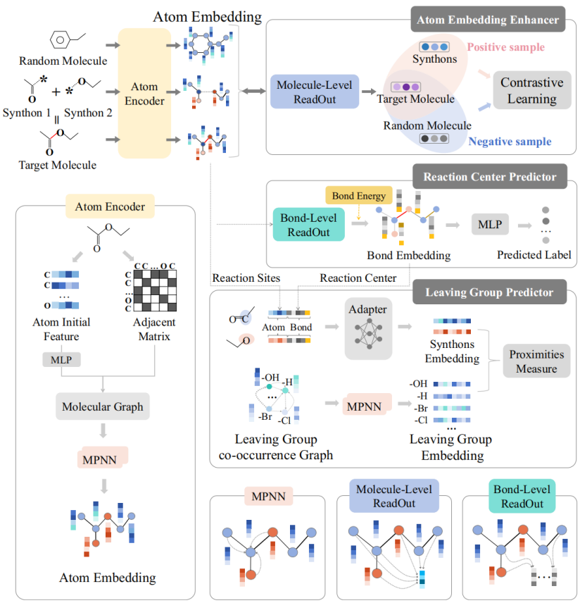 逆合成推理是根据目标分子的结构推断出可用的反应物,这一过程为化学合成的数字化和智能化提供了新的方向。施建宇教授团队提出的Retro-MTGR框架(图1),基于分子图,通过多任务学习(MTL)同时解决三个任务:识别反应中心、识别离去基和生成精准的原子嵌入。研究为了验证Retro-MTGR的可解释性,具体回答了两个关键问题:哪些键可以成为反应中心?哪些离去基适合于特定的合成子?