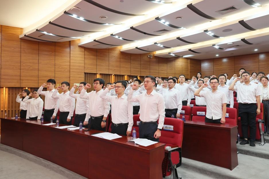 在王秉路的领誓下,全体新入职教师整齐肃立,庄严宣誓。铿锵有力的誓言表达了全体教师坚守立德树人初心的坚定信念,更道出了献身党的教育事业的满腔赤诚。