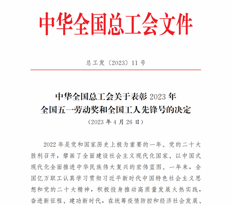 全国五一劳动奖章是中华全国总工会授予在中国特色社会主义建设中做出突出贡献的劳动者的光荣称号,是中国工人阶级最高奖项之一,旨在树立在社会主义各项建设事业中做出突出贡献的职工。在全面贯彻落实党的二十大精神的开局之年,为充分发挥工人阶级典型模范带头作用,团结动员亿万职工为实现中华民族伟大复兴的中国梦不懈奋斗。