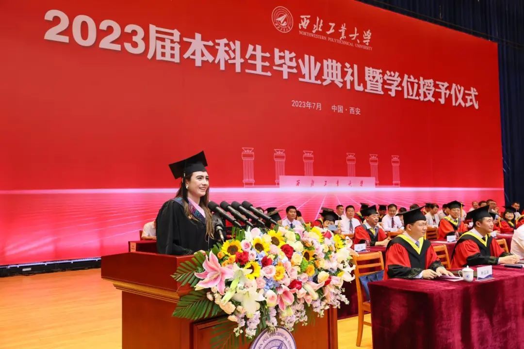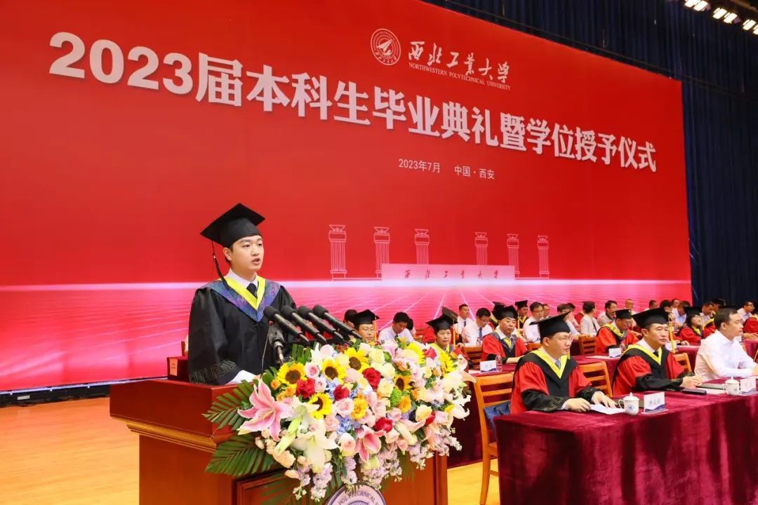 毕业生代表、玛丽女王工程学院李亮辰代表全体毕业生向母校、师长、父母致以感激与敬意。他说,求学四年,在西工大不仅学到了丰富的专业知识,更成长为一个坚定理想信念、勇担时代责任、练就过硬本领、矢志不渝奋斗的新时代工大人。梦想在西工大生根发芽,工大学子敢于追梦、勤于圆梦。未来他会秉承“公诚勇毅”校训,弘扬“三实一新”校风,将自身梦想与国家重大战略需求紧密结合,在创新创业的平台着力解决行业发展的重大问题,真正将论文写在祖国的大地上。