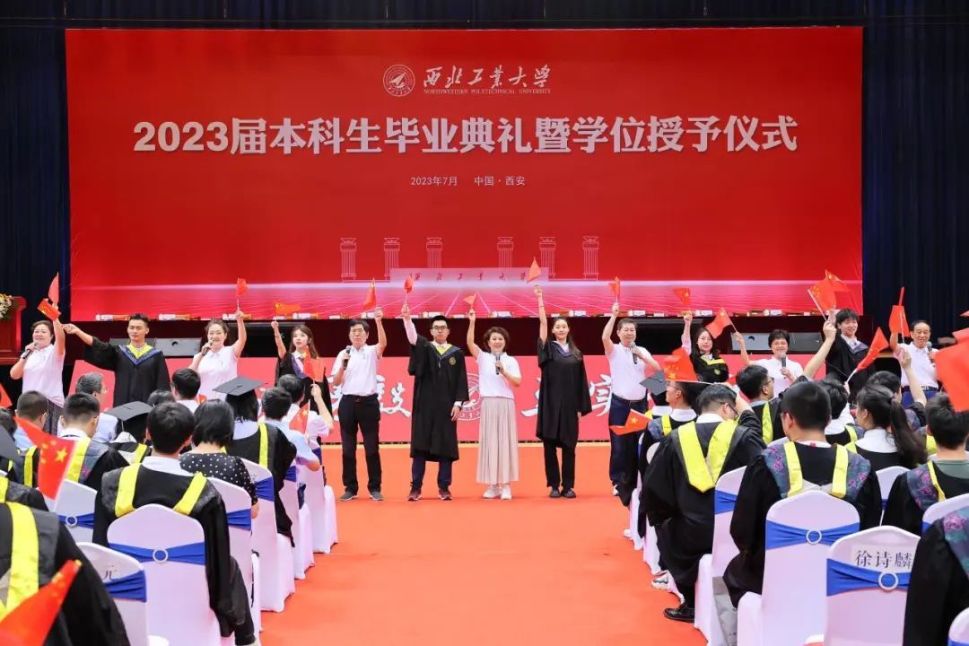 《追光者》《星辰大海》《起风了》……毕业生们演出的快闪歌曲点亮场内氛围,大学生艺术团、离退休红枫叶合唱团联唱《启程》《送别》《祖国不会忘记》,歌声饱含深情、催人奋进。2023届本科毕业纪念视频《我和我的西工大》更是让同学们回忆四年成长,触动了毕业生心底最柔软的地方。