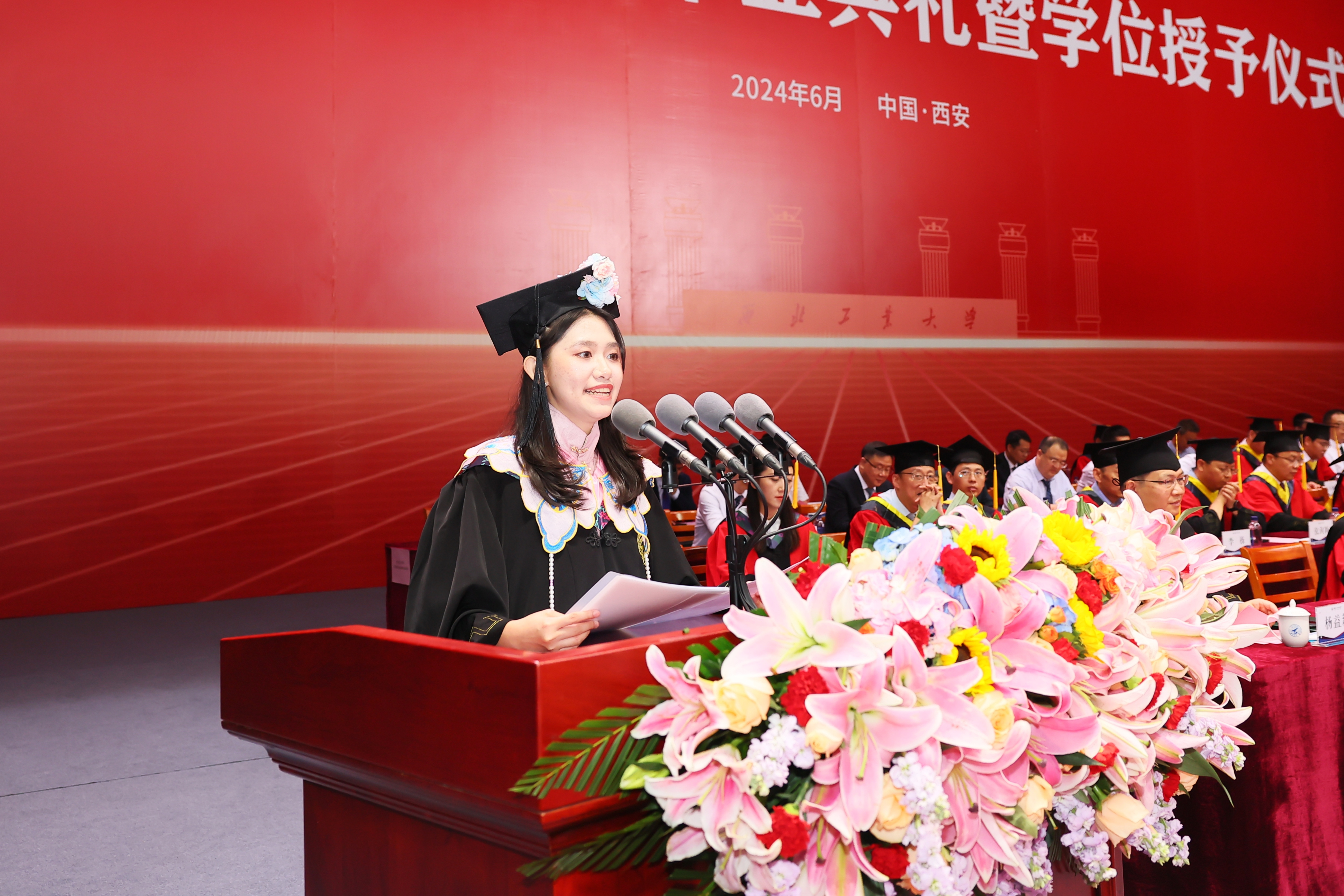 留学毕业生代表、公共政策与管理学院的吴妮嘉(Thessalonica Eunice Gunawan)来自美丽的千岛之国印度尼西亚,她用在中国学到的几句古诗“学向勤中得,萤窗万卷书”“有朋自远方来,不亦乐乎”“海内存知己,天涯若比邻”串联,动情地分享了在西工大求学的收获与感动,表达对母校深深的感谢和眷恋。未来,她将投身于促进中国与印尼共同繁荣的事业中去,努力向世界讲述真实的中国故事和西工大故事,担当起中外文化交流的桥梁。最后,她深情地表示:我爱西工大!我爱中国!这里是我永远的家!