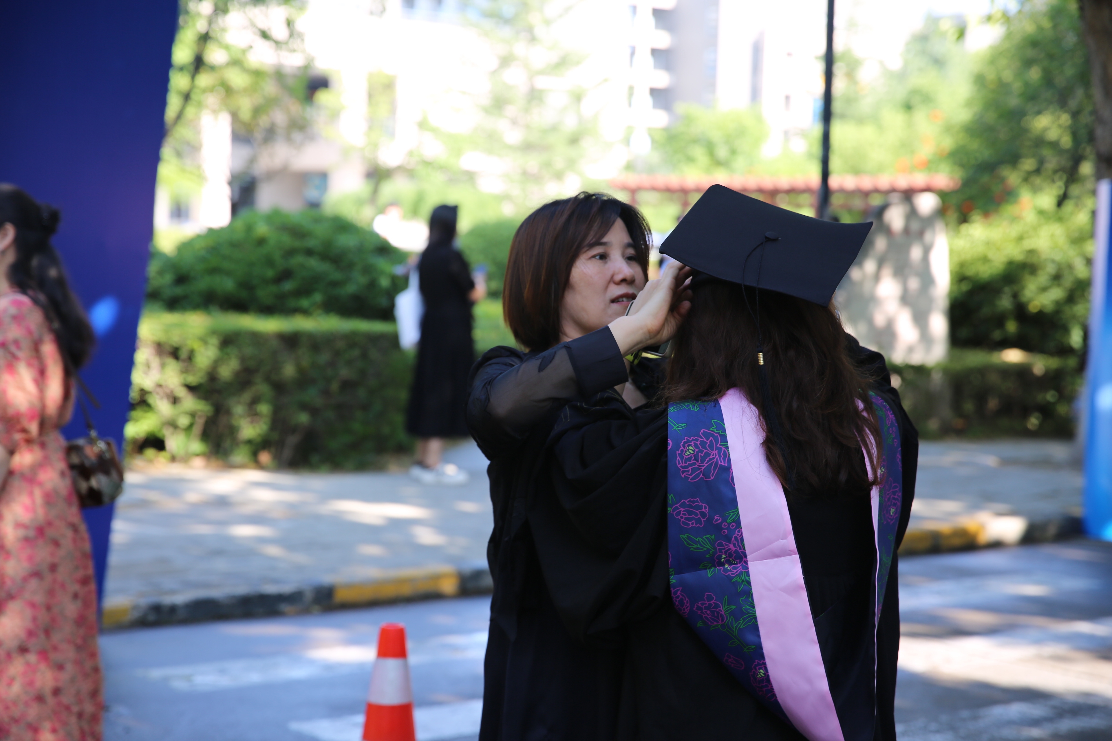 前排就座的校领导、院士、杰出校友等为毕业生代表拨穗正冠、颁发毕业证书并合影留念。各学院学位评定委员会成员在毕业典礼结束后分别为本单位毕业生颁证、拨穗。