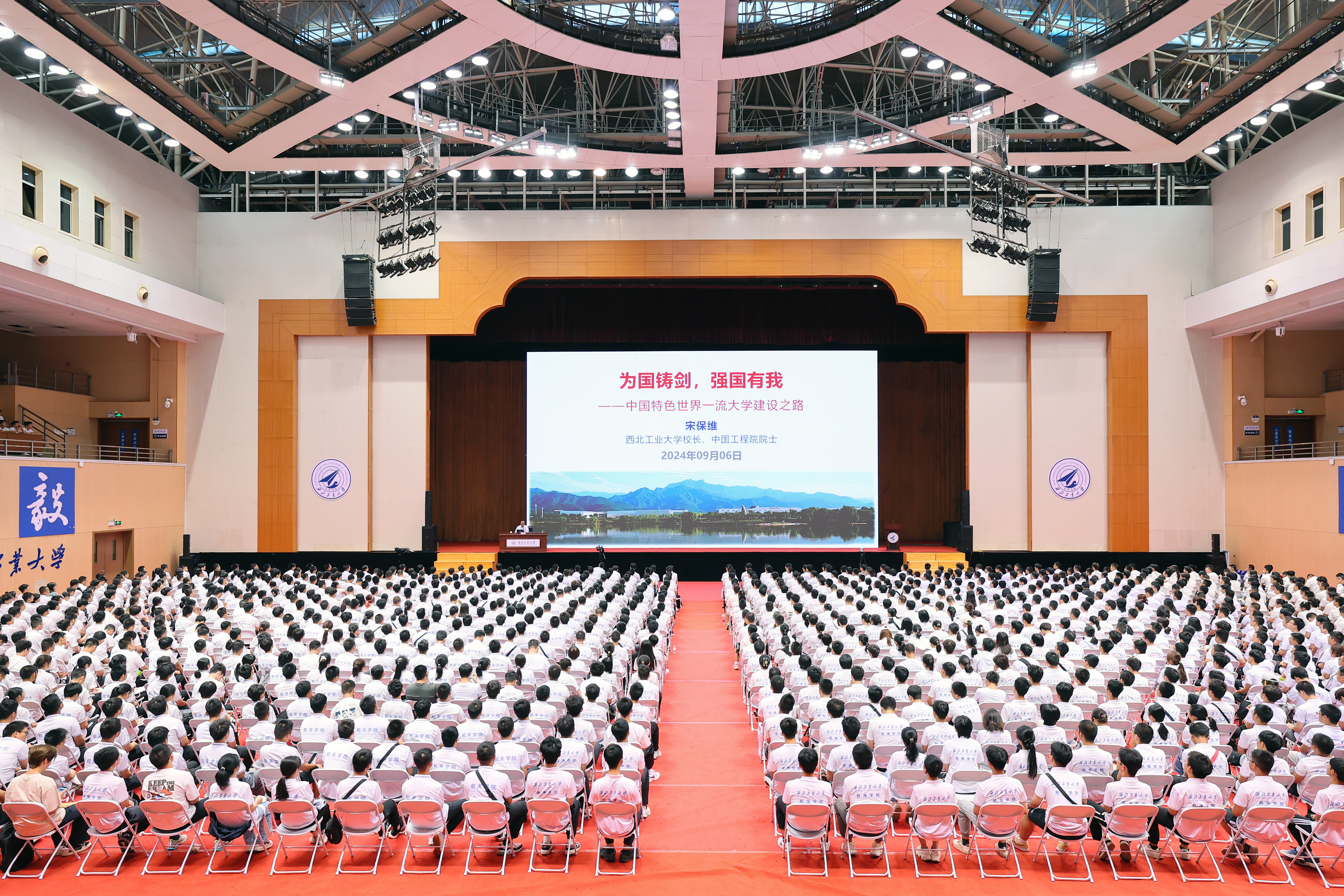 “亲爱的2024级师弟师妹们好!42年前,我从东北背着行囊来到西工大,开始了本科、硕士和博士阶段的学习并留校工作。一路走来,见证并参与了学校的发展建设,看到朝气蓬勃、意气风发的你们,我对学校的未来更加充满了信心。”宋保维从“三脉融合,一所有底蕴的大学”“育人铸剑,一所有使命的大学”“继承巩固,一所有担当的大学”“创新发展,一所有追求的大学”四个方面带领同学们回顾了西工大的发展历程、校情校貌,介绍了学校的办学定位、办学目标和人才培养特色,列举了西工大培养的先生大师、兴业英才,概述了学校发展总体规划,“127”近期发展目标以及“天下工大、世界三航”远景目标的内涵意义。他强调,在扎根西部、献身国防的建设历程中,西工大始终坚持立德树人、育领军人才,始终坚持科技创新、铸国之重器,始终坚持与时俱进、担时代大任,为强国建设民族复兴贡献力量。