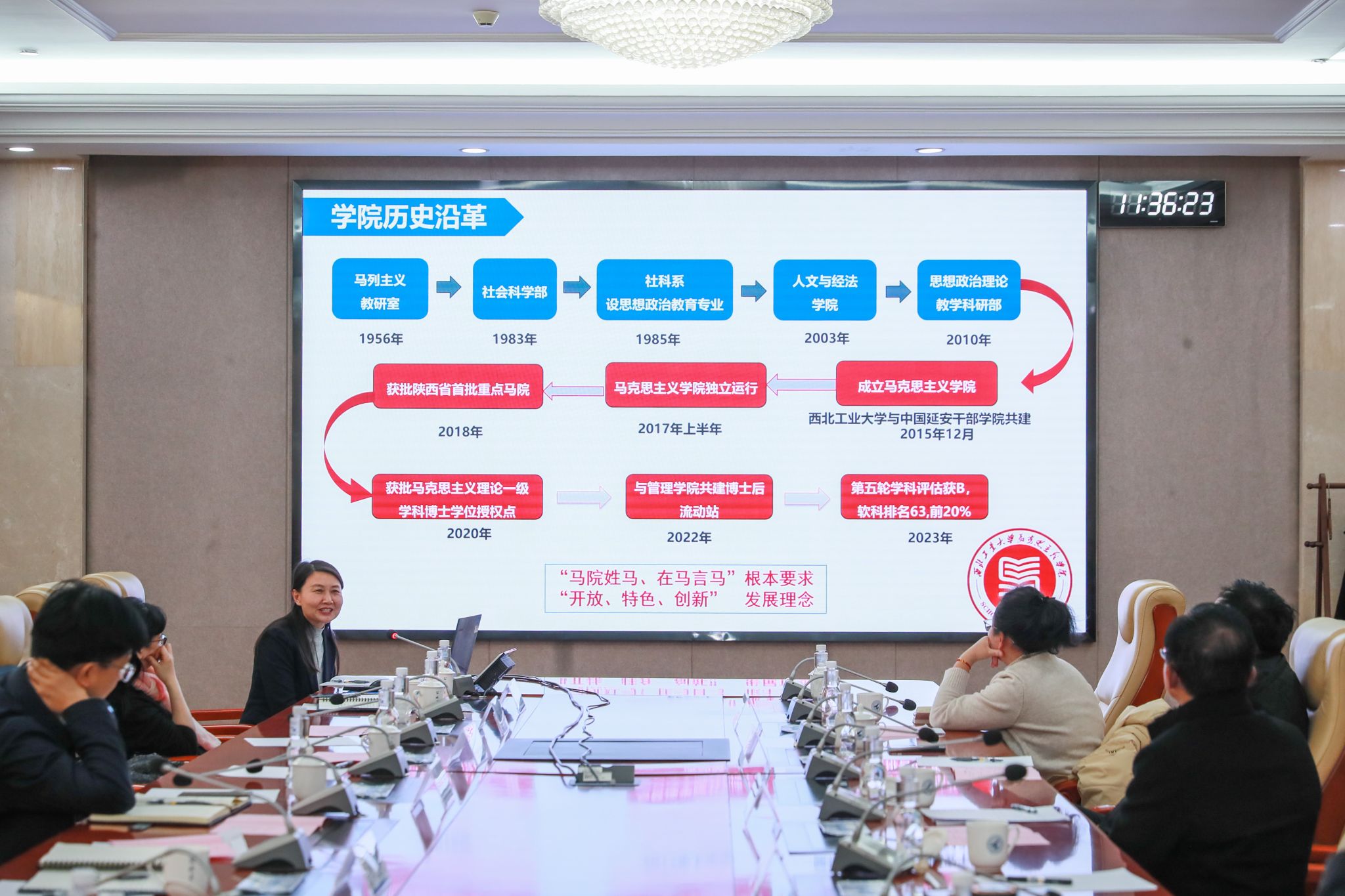 座谈会上,杨晓代表学校致辞,并向来校调研的专家表示热烈的欢迎。他表示,国际形势继续发生深刻复杂变化,百年未有之大变局加速演进。高校马克思主义学院就是要坚持“马院姓马,在马言马”的鲜明导向和办学原则,学校党委高度重视马克思主义学院建设。面对新形势、新任务、新挑战,希望双方能继续发挥学科建设、人才队伍、干部挂职、红色资源、延安精神研究等优势,充分调动双方的力量和资源,拓展以马克思主义理论为牵引的学科方向,进一步扩大“党中央在延安十三年”的新时代学术影响力,进一步提升双方的学术影响力、学科引领力和人才培养质量,不断结出合作共建的新硕果。