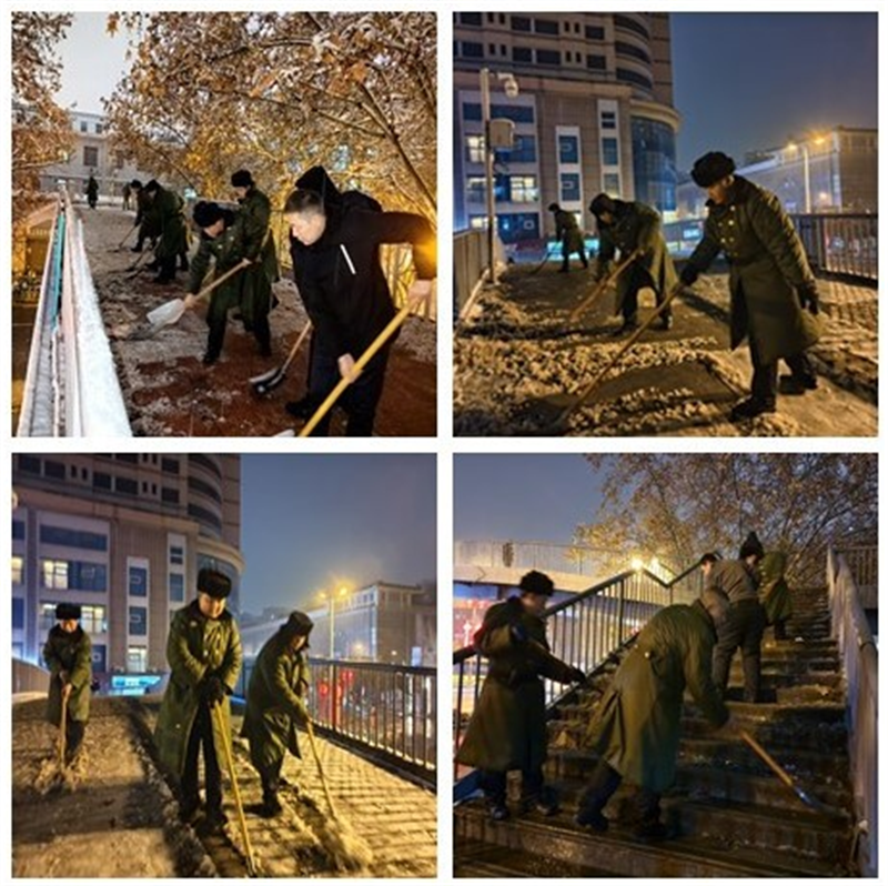 保卫处高度重视在校师生的出行安全,为消除大雪天气带来的交通安全隐患,1月16日晚,保卫处组织校卫队员清扫积雪。大家分工协作,加班加点在积雪路段撒融雪剂,尽快清扫积雪,经过数小时的努力,成功将各大门内外道路上及西门、南门外天桥上的积雪全部铲除清理完毕,真正做到用情用心服务,受到了广大师生家属一致好评与点赞。