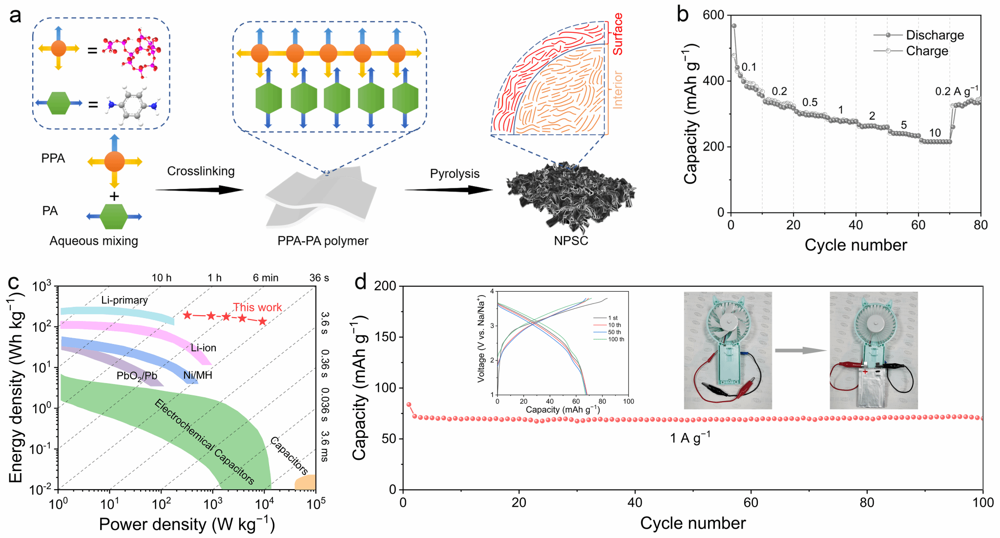 图1 (a)NPSC的合成示意图、(b)倍率性能、(c)全电池拉贡图、(d)全电池在大电流密度下的循环性能